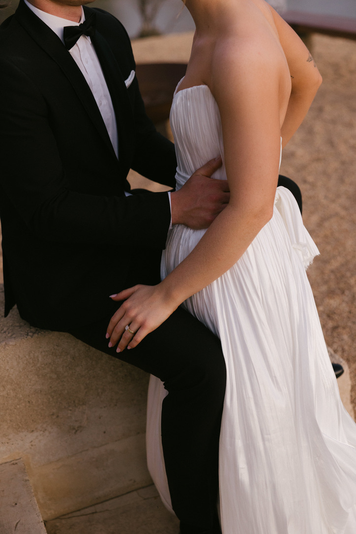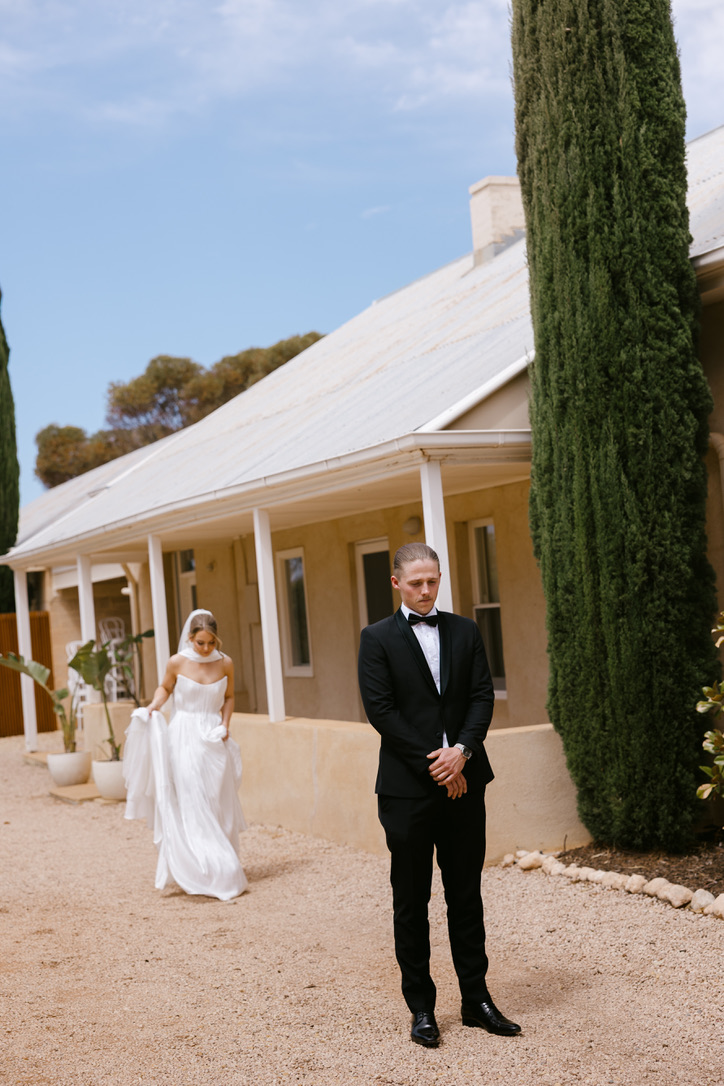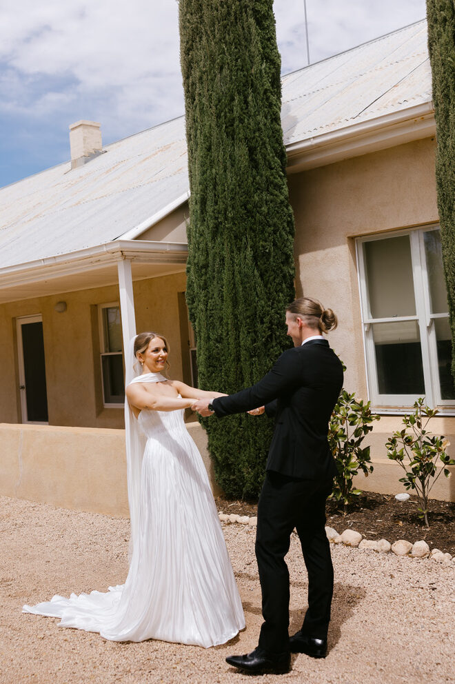 Before the day truly unfurled, Sophie and Jackson chose to share a First Look and see one another privately. Beneath the tall cypress trees that line the property, they shared a moment that was both centred and deeply emotional–an exhale before the celebration. The River Vista, with its vast stretch of ochre cliffs and open sky, created a stillness around them that felt almost cinematic.