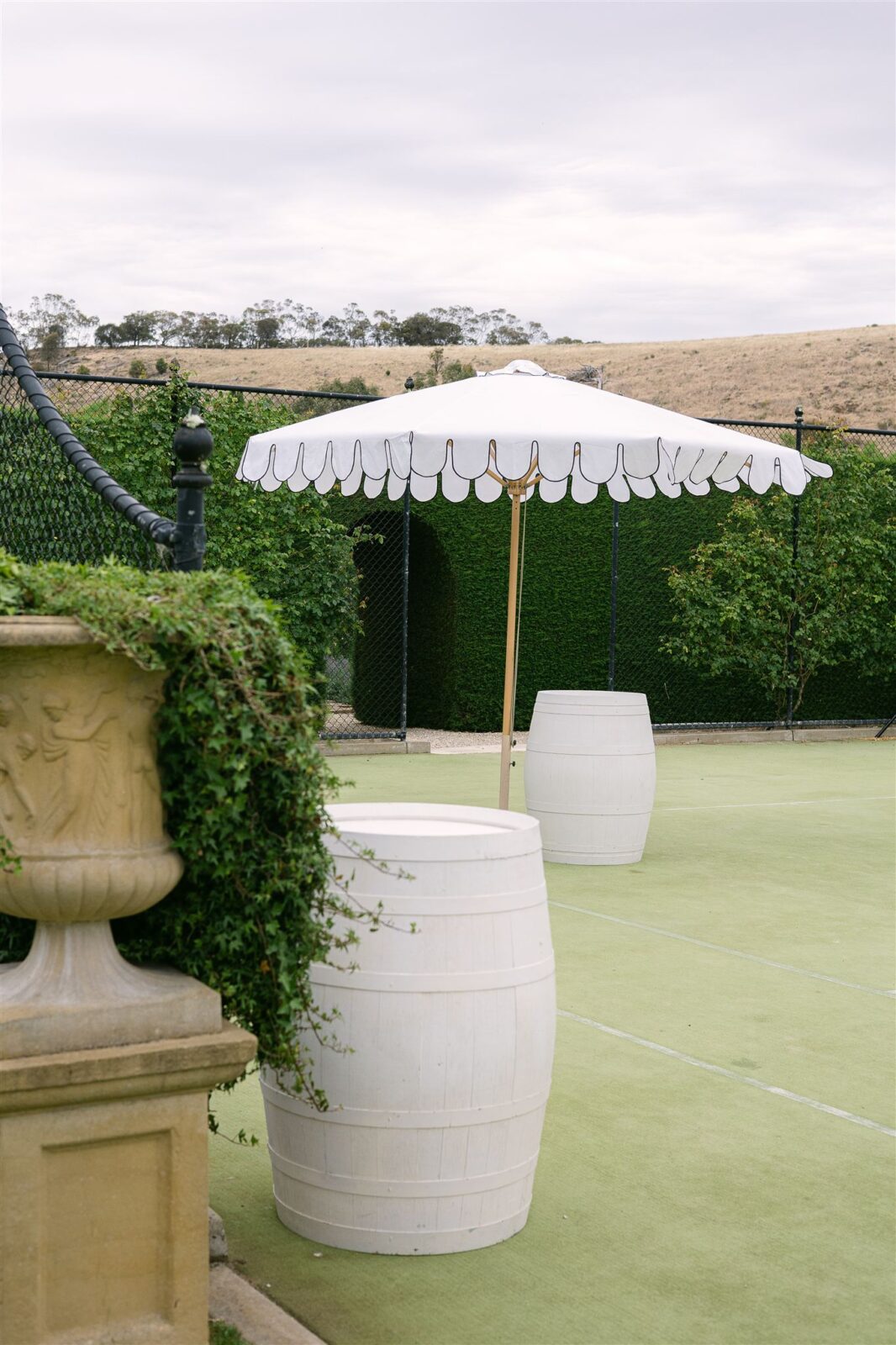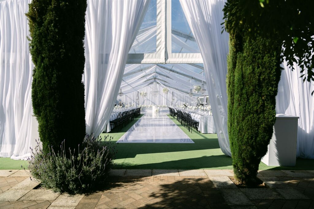 What makes Mandalay particularly compelling is the way the space has been designed to flow. Each section of the property feels intentional, from the sculpted hedges that encompass lawned vignettes, to the tennis courts backed by those scenic Australiana hills ready for the perfect open-air summer wedding. As evening drops, the property takes on a quieter, more atmospheric feel, with the surrounding hills absorbing sound and light in a way that feels intimate and contained. Mandalay simultaneously offers flow and a sense of structure without feeling rigid, it provides the perfect foundation of elegance that couples can then tailor to their taste.