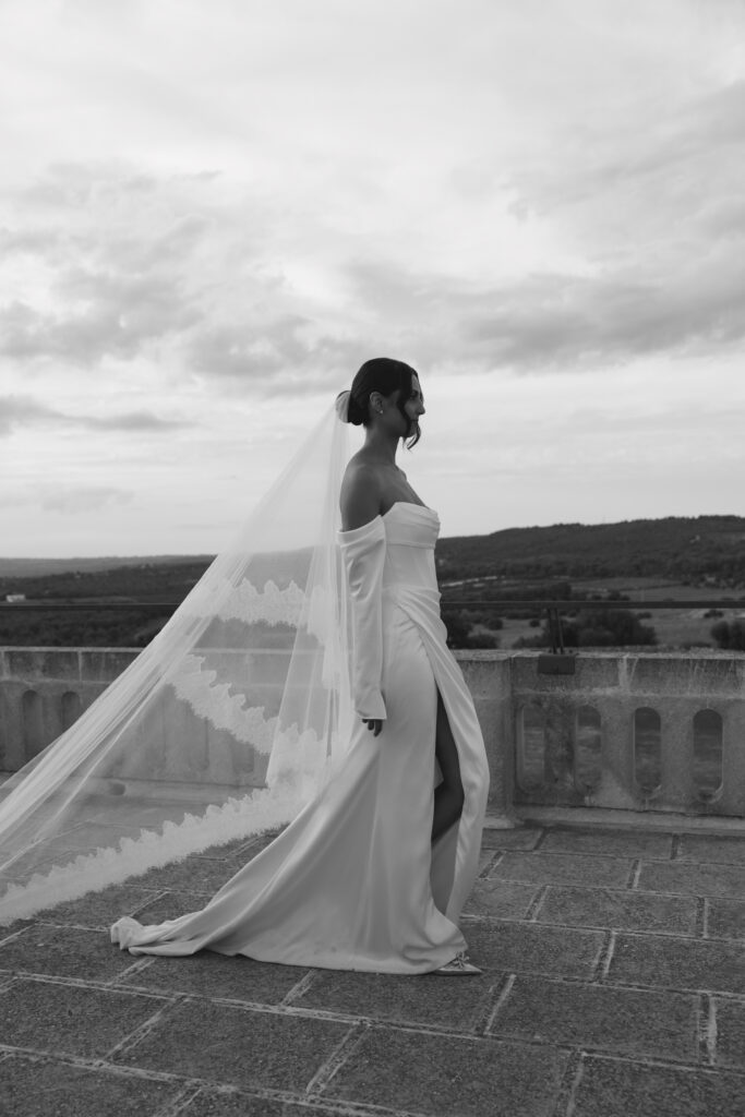 The ceremony styling drew from the region itself: ivory florals, sculptural greenery, and warm red accents that echoed Puglia’s earth and fruit. The breeze carried softly through the courtyard as family and friends watched Melanie walk in wearing her structured Kyha Studios gown.