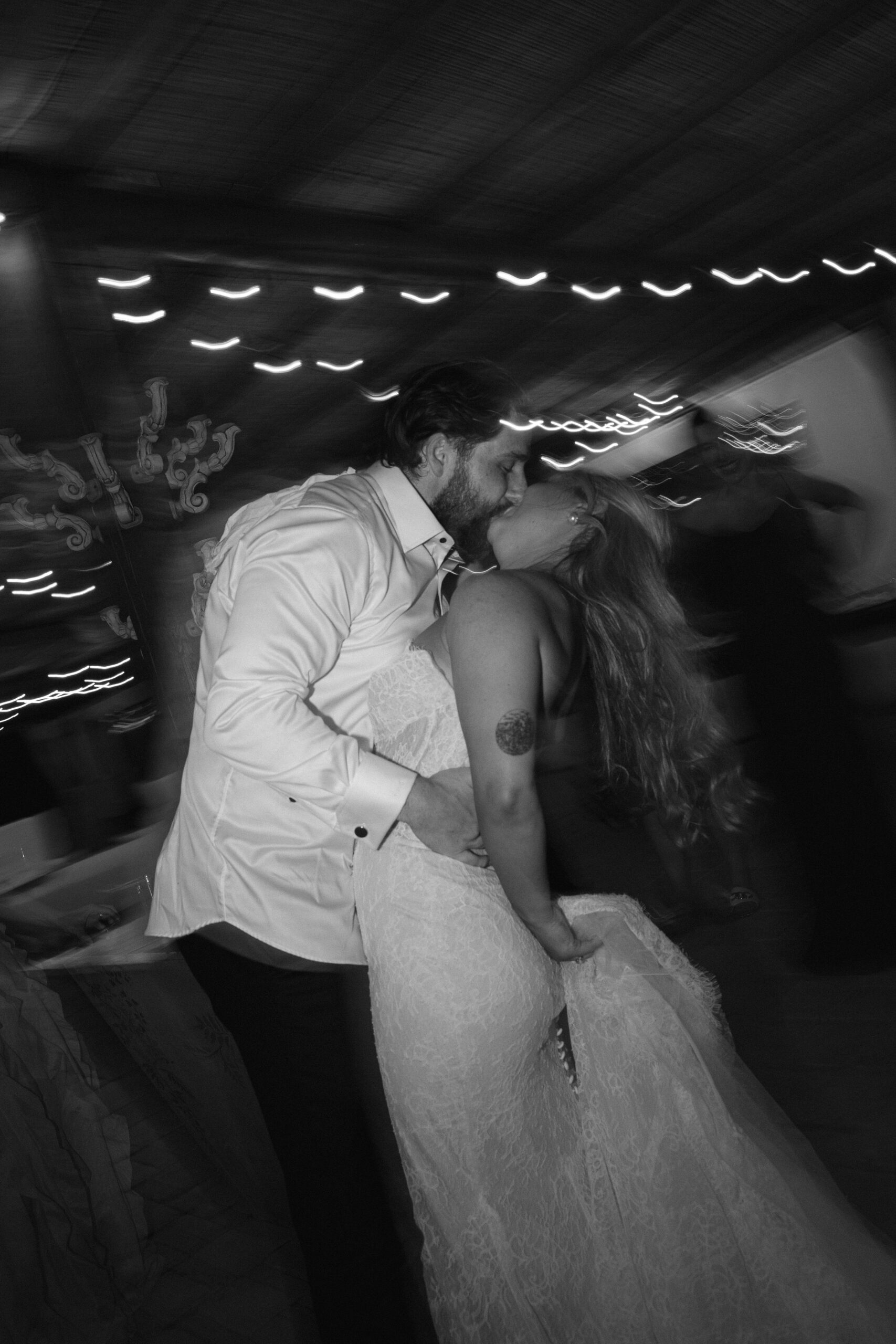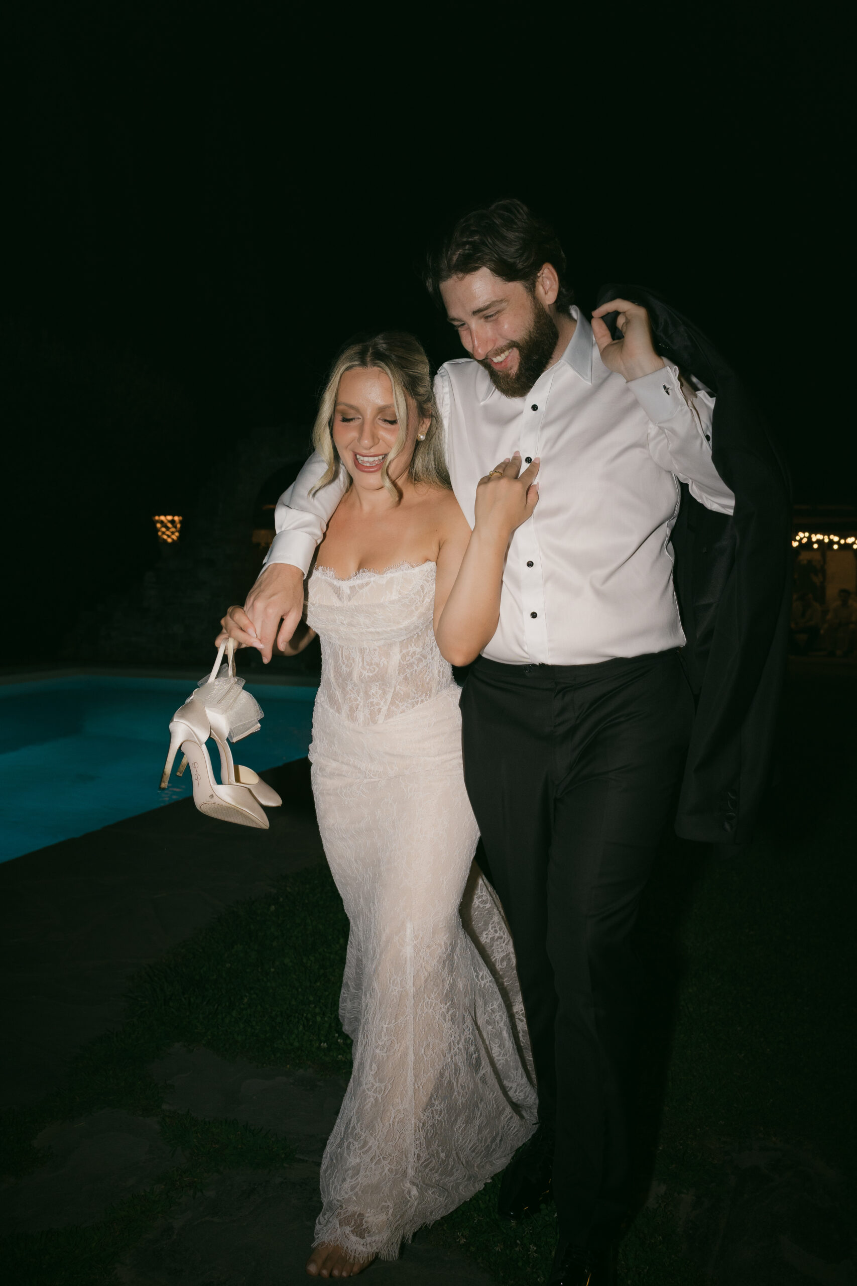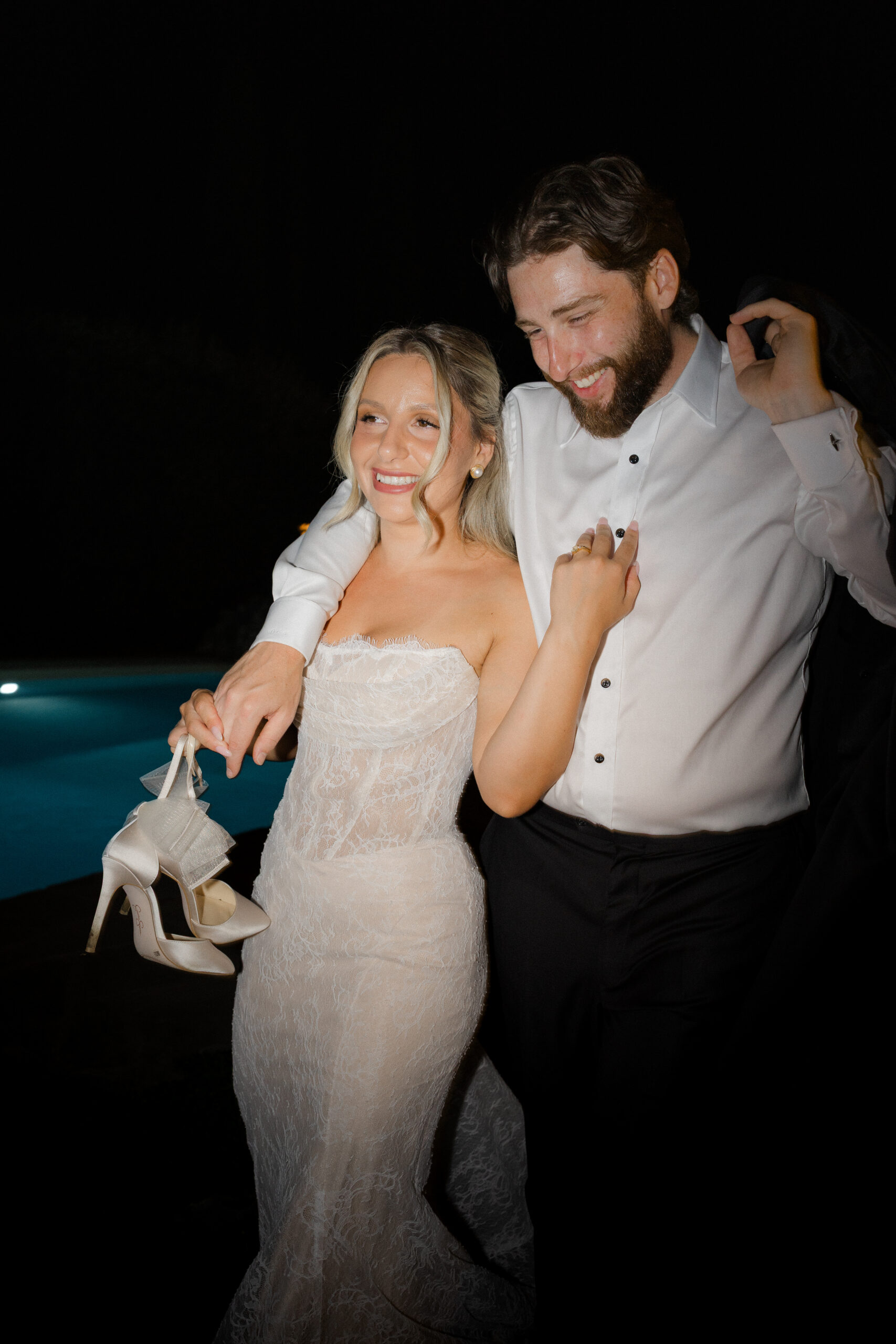 String lights glow against the stone, guests move barefoot across the terrace, music spills from the reception space, and the warmth of the day lingers just enough to keep everyone outside.