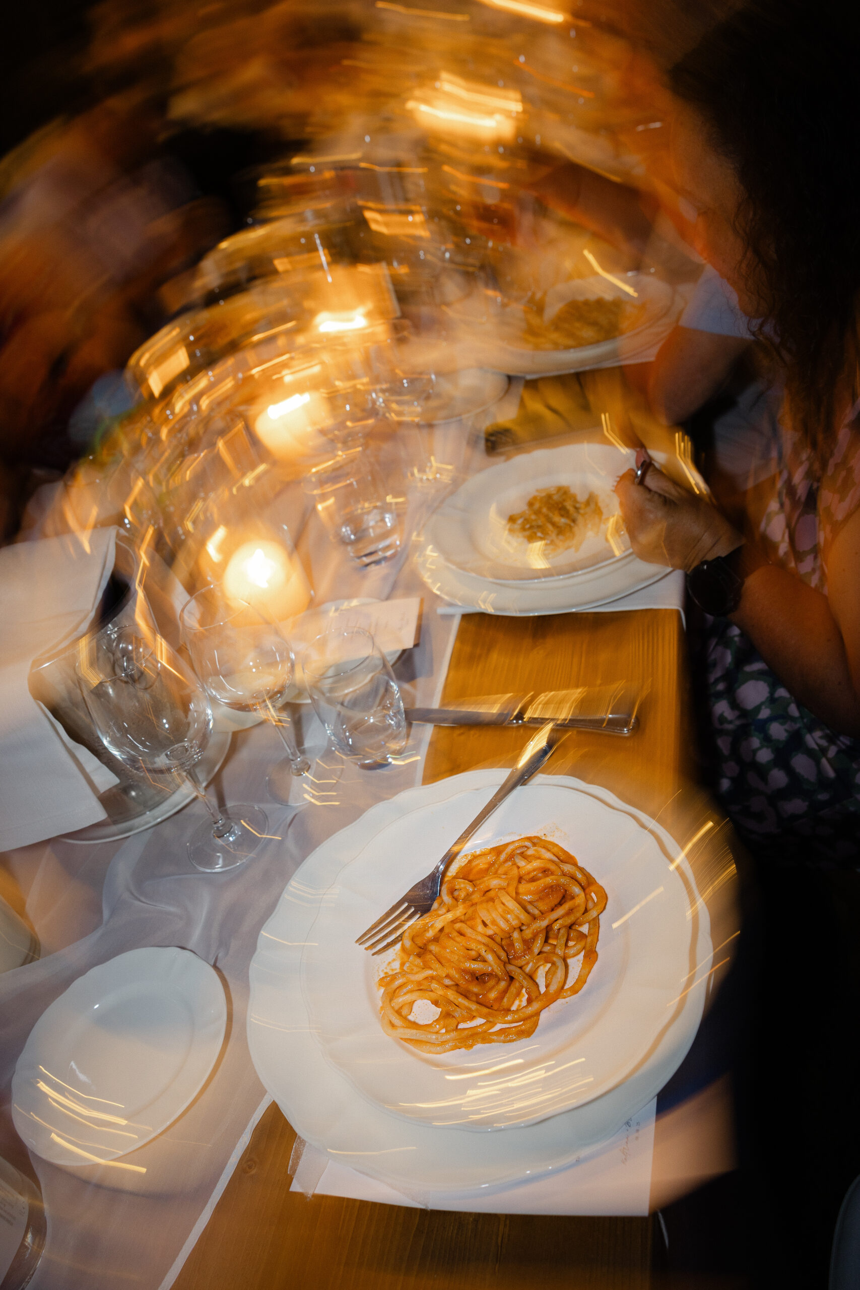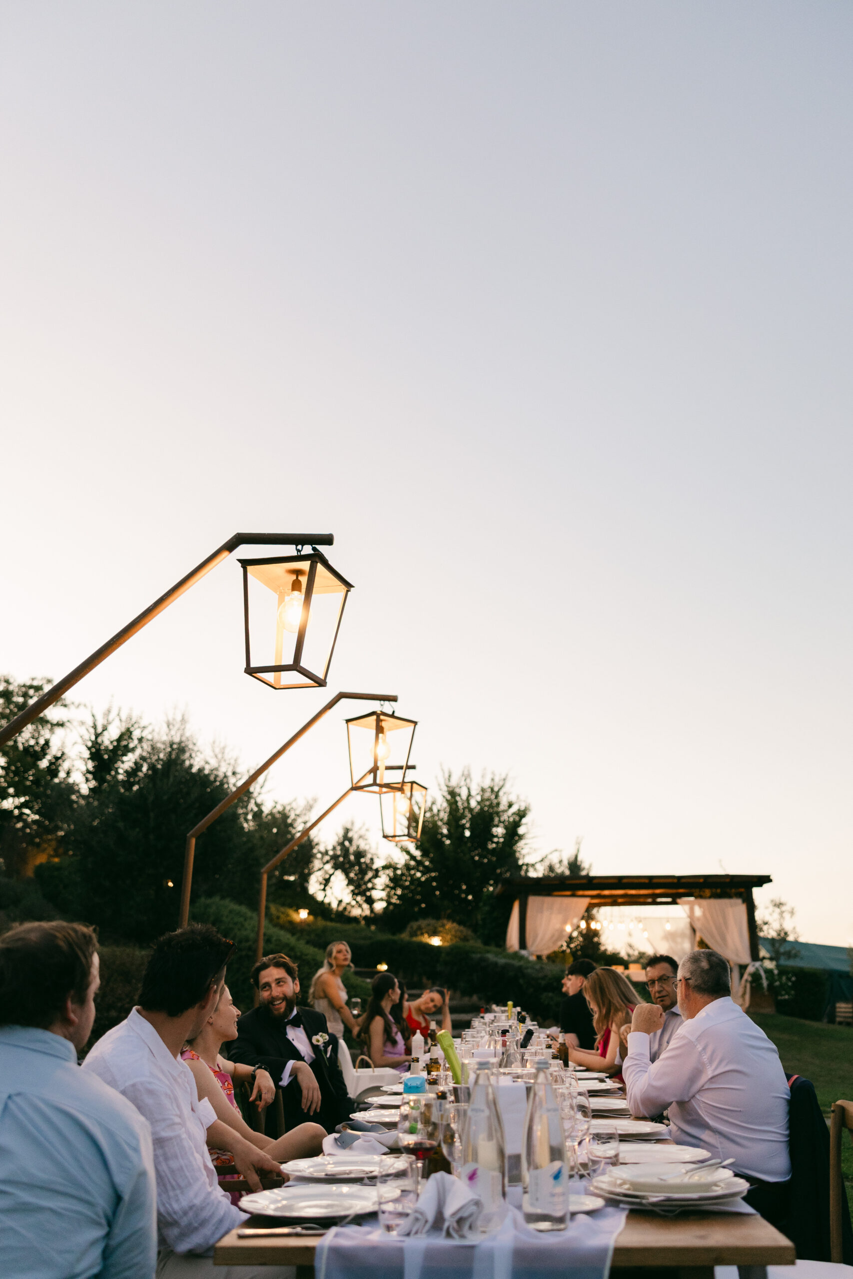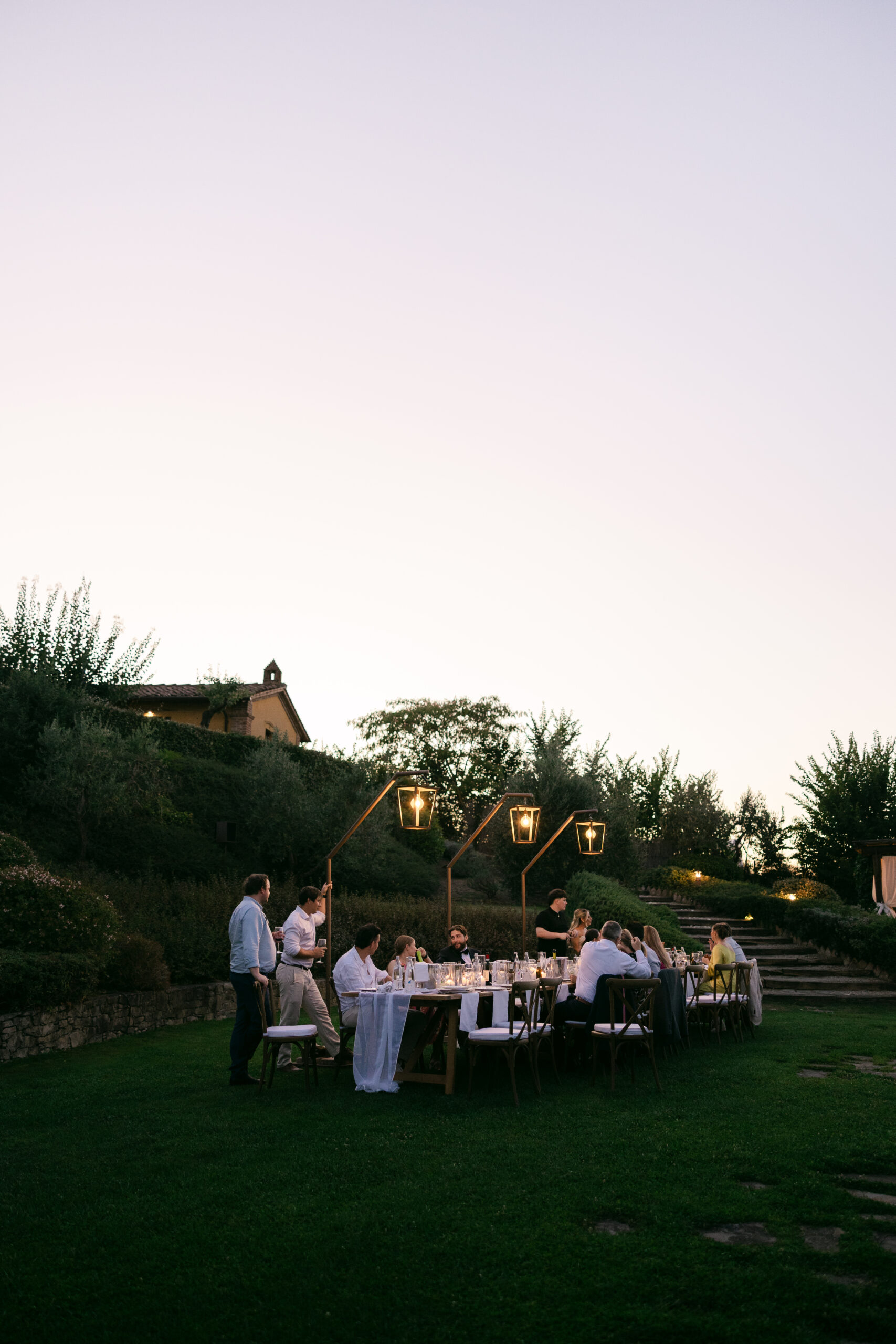 As the sun sinks, the estate cools, and the night takes on a softness that feels distinctly Mediterranean. Long tables, candle clusters, linen textures, bottles of Chianti, plates that never stay empty, laughter, speeches, olive trees swaying behind the lights — it’s a tableau straight from an Italian summer film.